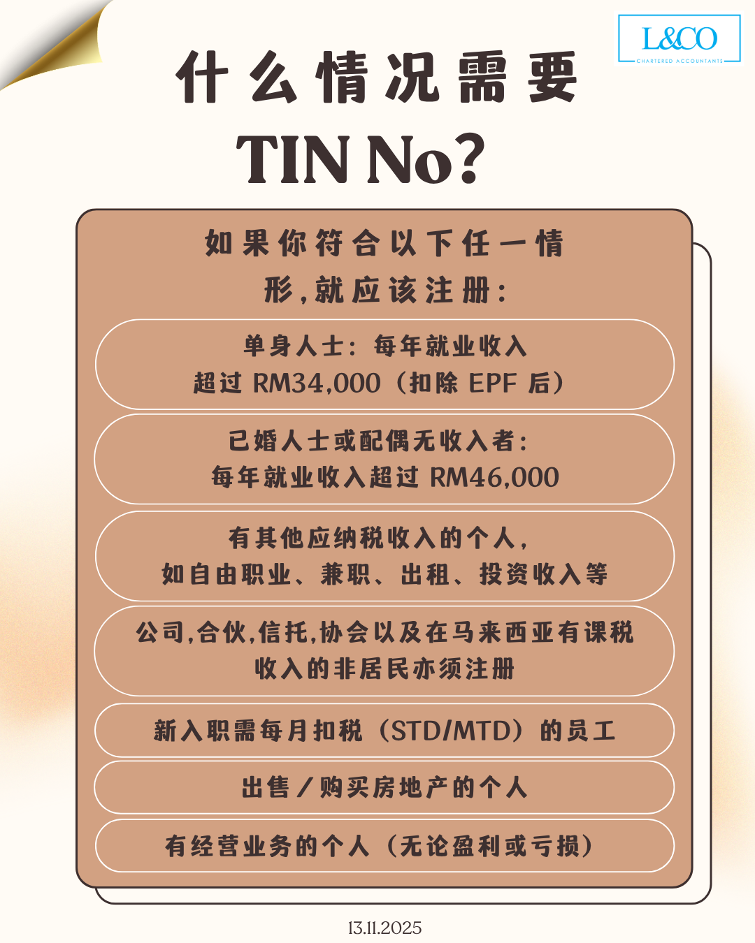 自 2023 年起,马来西亚内陆税收局(LHDN)全面启用 TIN(Tax Identification Number)作为统一税务识别编号。凡符合以下任一情况,个人或实体均应向 LHDN 注册 TIN: 受雇人士 单身人士: 年度就业收入(扣除 EPF 后)超过约 RM34,000 已婚人士或配偶无收入者: 年度就业收入(扣除 EPF 后)超过约 RM46,000 以上金额为常见报税参考门槛,实际要求将根据个人税务义务而定。 拥有其他应纳税收入的个人 若您拥有以下任一收入来源,亦需申请 TIN: 自由职业或自雇收入 [...]