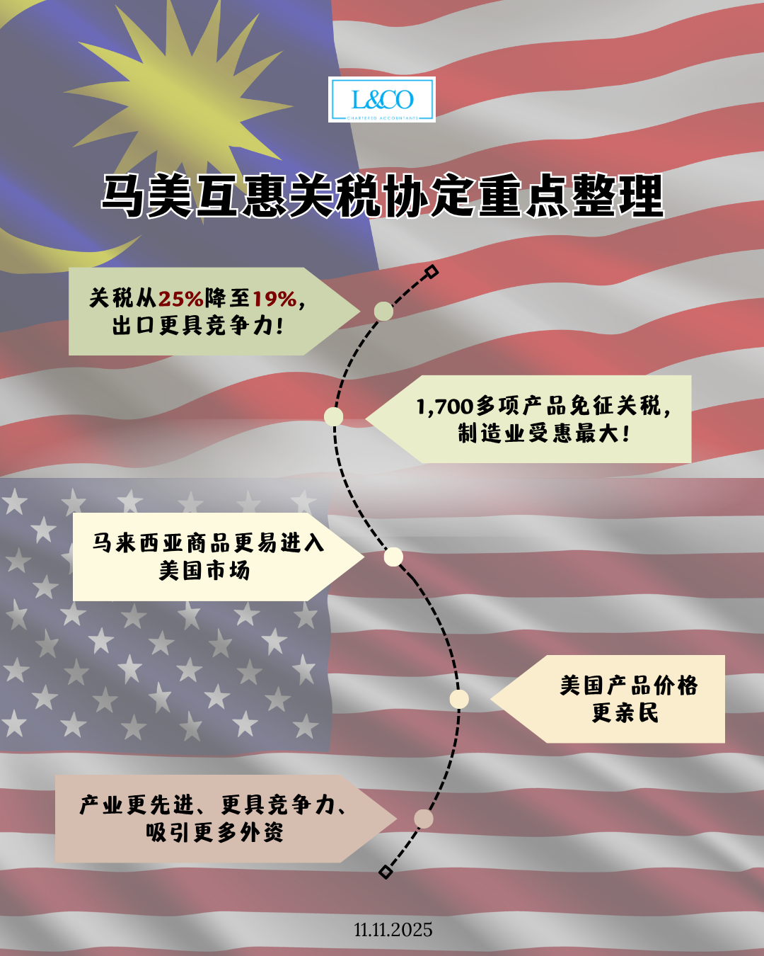 马来西亚与美国携手签署《互惠关税协定》(ART),标志着两国经贸合作迈入全新阶段,为企业与投资者打开更广阔的市场大门。 5大重点整理 关税从25%降至19% — 出口更具竞争力! 1,700多项产品免征关税 — 制造业受惠最大! 马来西亚商品更易进入美国市场 美国产品价格更亲民 产业更先进、更具竞争力、吸引更多外资 **资料更新于17.11.2025