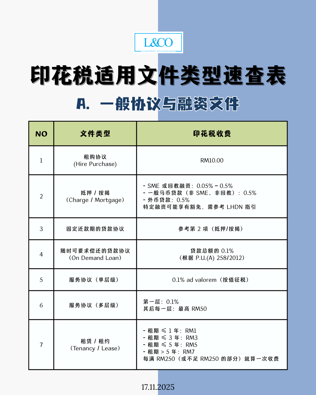 不确定哪些文件需要印花税?税率怎么算?这里给你最完整、最清晰的整理,一篇搞懂常见协议、贷款、租赁、产业转让、股票及保险文件的印花税! A. 一般协议与融资文件 序号 文件类型(通俗解释) 印花税收费 1 租购协议(Hire Purchase) RM10.00 2 抵押 / 按揭(Charge / Mortgage) - SME 或回教融资:0.05% – 0.5% - 一般马币贷款(非 SME、非回教):0.5% - [...]