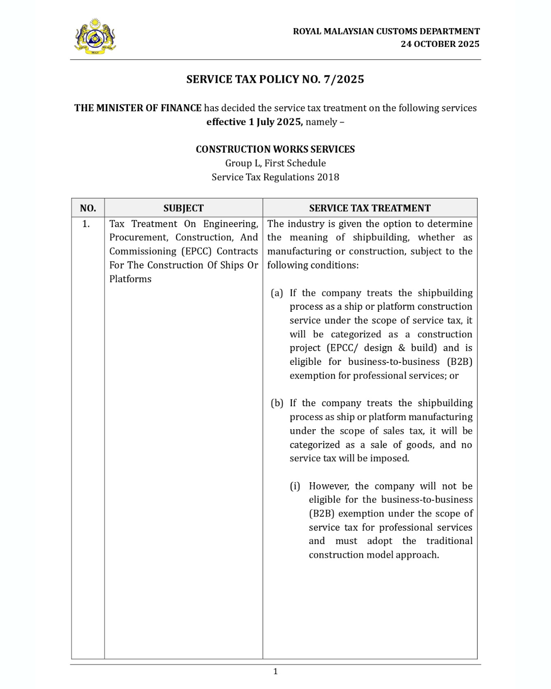 我们整理了政府最新发布的 Service Tax Policy 7/2025,特别针对建筑行业、承包商与发展商重点解析。 1. EPCC 合同(Engineering, Procurement, Construction & Commissioning)— 船舶与平台建造的 SST 处理方式 海关允许行业自行决定「船舶建造」要被视为制造业 (Sales Tax) 还是建筑业 (Service Tax) 可选择两种方式: (A)当作建筑业服务(Construction Service) ✔ [...]