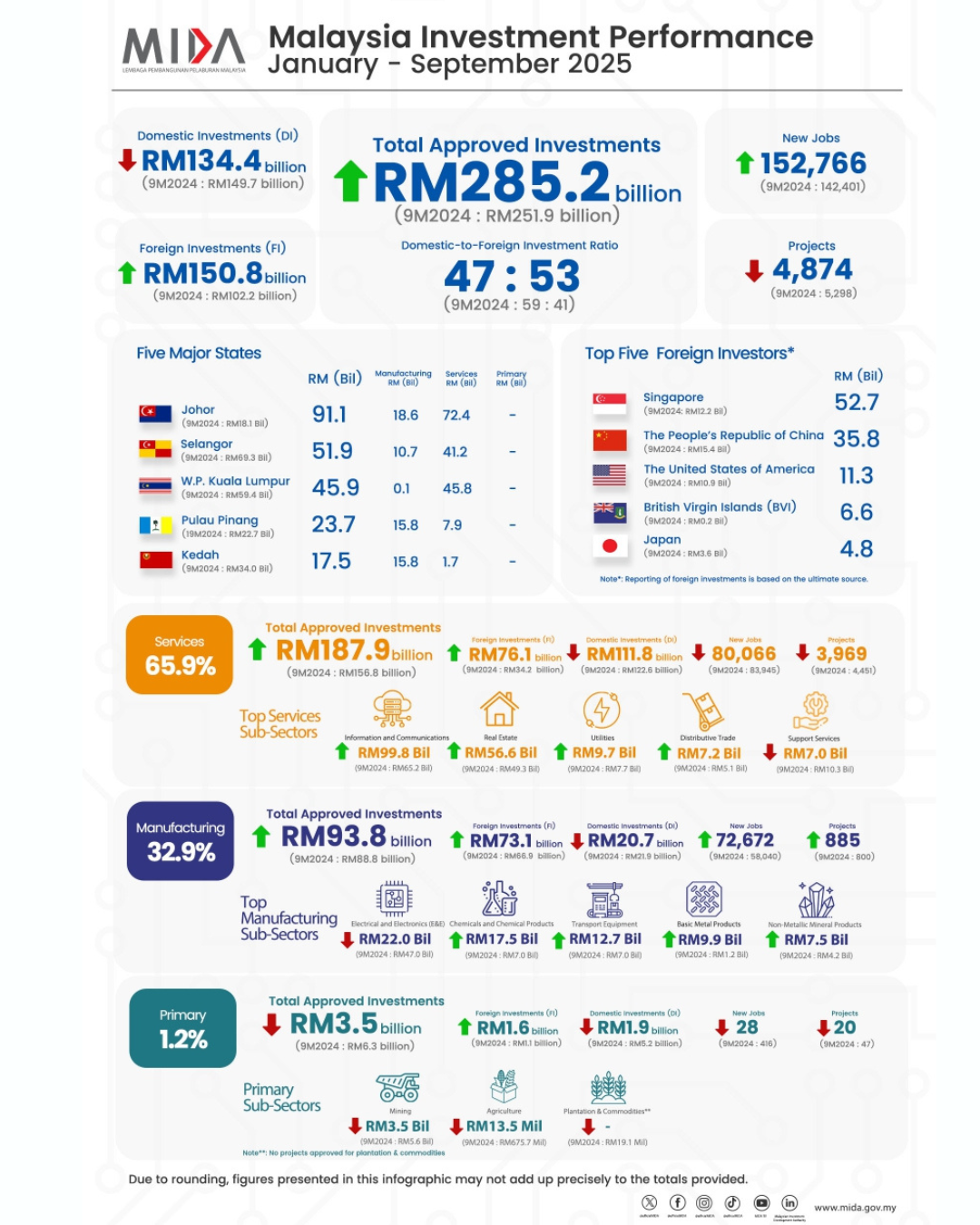 【马来西亚最新投资成绩:2025 年前 9 个月批准投资额达 RM2852 亿,年增 13.2%】 柔佛遥遥领先,全国第一!对企业意味着什么? 根据马来西亚投资发展局(MIDA)刚发布的最新 2025 年度投资数据,马来西亚在全球经济不确定的情况下依然吸引大量投资,展现出强劲和稳定的投资吸引力。 以下为重点摘要: 一、马来西亚投资增长整体表现亮眼马来西亚在 2025 年前九个月(9M 2025)共批准投资 RM2852 亿, 同比增长 13.2%,显示投资信心稳步增强。 服务业:RM1879 亿(65.9%) – 年增 19.8%,增长最强 [...]