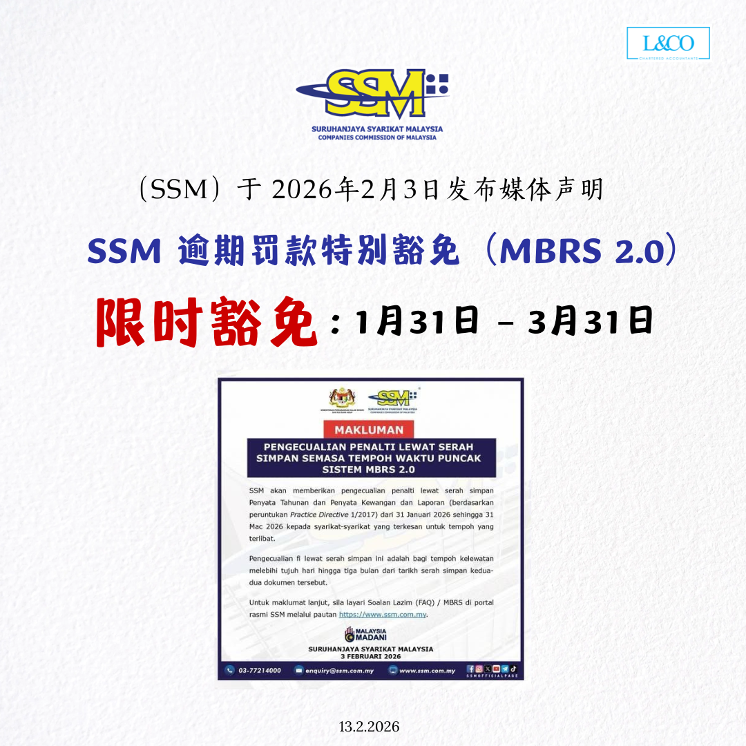 马来西亚公司委员会(Suruhanjaya Syarikat Malaysia,简称 SSM)已于 2026年2月3日 发出通知,针对通过 MBRS System 2.0 提交的部分法定文件,提供逾期提交罚款豁免。 根据 Practice Directive 2017,此项豁免适用于以下文件: 周年申报表(Annual Returns) 财务报表及报告(Financial Statements and Reports) 豁免期限 凡于 2026年1月31日 至 2026年3月31日 [...]