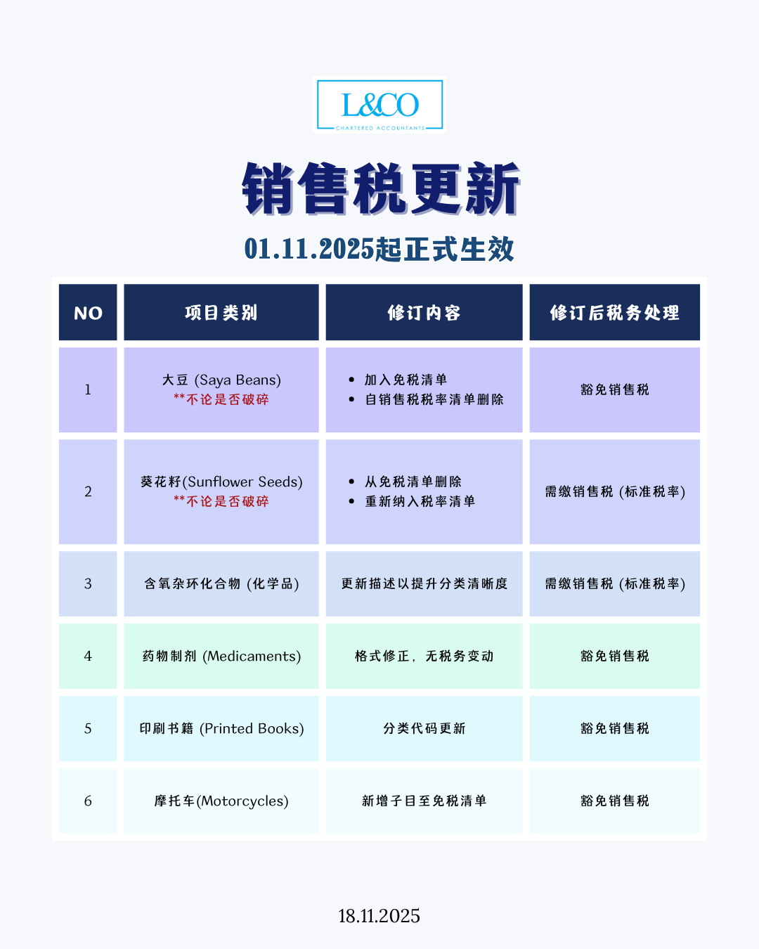 最新免税 & 应税项目一次看懂! 1. 大豆(Soya Beans) **不论是否破碎 修订内容:加入免税清单,自销售税税率清单删除 修订后税务处理:豁免销售税 2. 葵花籽(Sunflower Seeds) **不论是否破碎 修订内容:从免税清单删除,重新纳入税率清单 修订后税务处理:需缴销售税(标准税率) 3. 含氧杂环化合物(化学品) 修订内容:更新描述以提升分类清晰度 修订后税务处理:需缴销售税(标准税率) 4. 药物制剂(Medicaments) 修订内容:格式修正,无税务变动 修订后税务处理:豁免销售税 5. 印刷书籍(Printed [...]